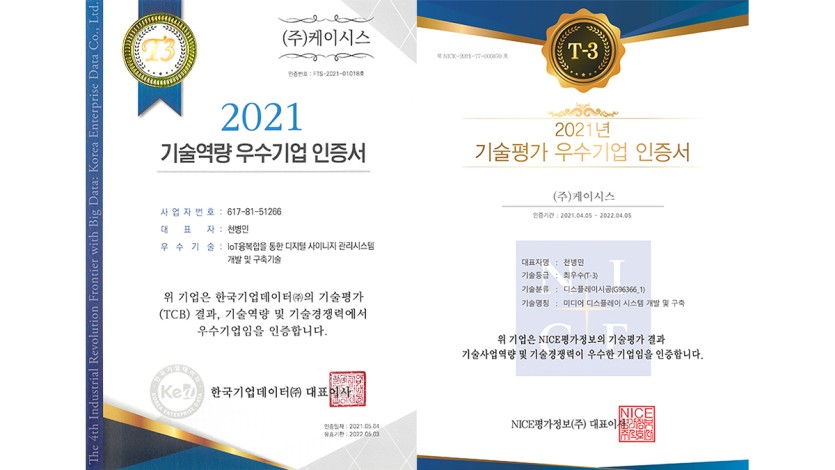 기술역량 우수기업 인증은 한국기업데이터(KED)의 공신력있는 기술신용평가(TCB: Tech Credit Bureau)로, 기업이 보유한 기술의 경제적 가치를 기업의 기술∙권리∙시장∙사업성에 대해 종합적으로 분석하고 평가하는 인증 제도이다. 이번 기술신용평가에서 케이시스는 “IoT 융복합을 통합 디지털 사이니지 관리시스템 개발 및 구축기술”로 ‘T3 등급’을 획득하였다.